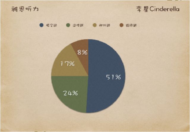 图一:雅思听力各大题型占比图, 填空题略胜于选择,各部分题型特点鲜明。
